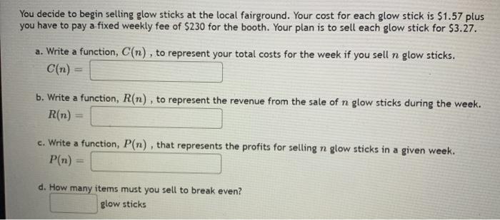 You decide to begin selling glow sticks at the local art festival