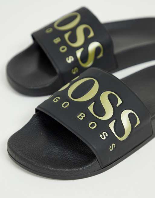 Hugo boss sliders discount black and gold